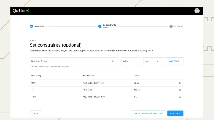 After uploading your board, you can choose to define constraints (in amps or mm/mils), import constraints from a prior design, or continue without defining constraints.