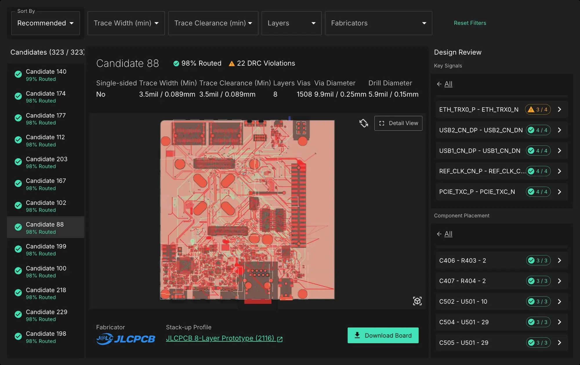 We chose to base our System-on-Module (SOM) + baseboard designs on the NXP i.MX 8M Mini evaluation platform. Lead engineer Ben Jordan prepared the design and constraints for the boards and submitted the jobs. Quilter ran parallel seeded runs with varied constraints, completing the layout in 27 hours, returning multiple ranked candidates.